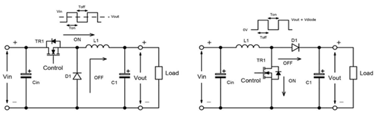 Wir schauen uns zunächst die beiden Typen von Gleichspannungswandlern an, nämlich Abwärts- und Aufwärtswandler. Mit Abwärtswandlern kann ein Gleichstromausgang geliefert werden, der niedriger ist als der Gleichstromeingang. Sie können verwendet werden, um unterschiedliche Spannungsschienen bereitzustellen, so dass empfindliche elektronische Komponenten keinen Spannungsspitzen ausgesetzt sind, die sie sonst beschädigen könnten. Der Schaltmechanismus in einem Abwärtswandler wird mit hoher Frequenz ein- und ausgeschaltet und speichert Energie in einer Drosselspule, wodurch eine Glättung der Ausgangswellenform erreicht wird.