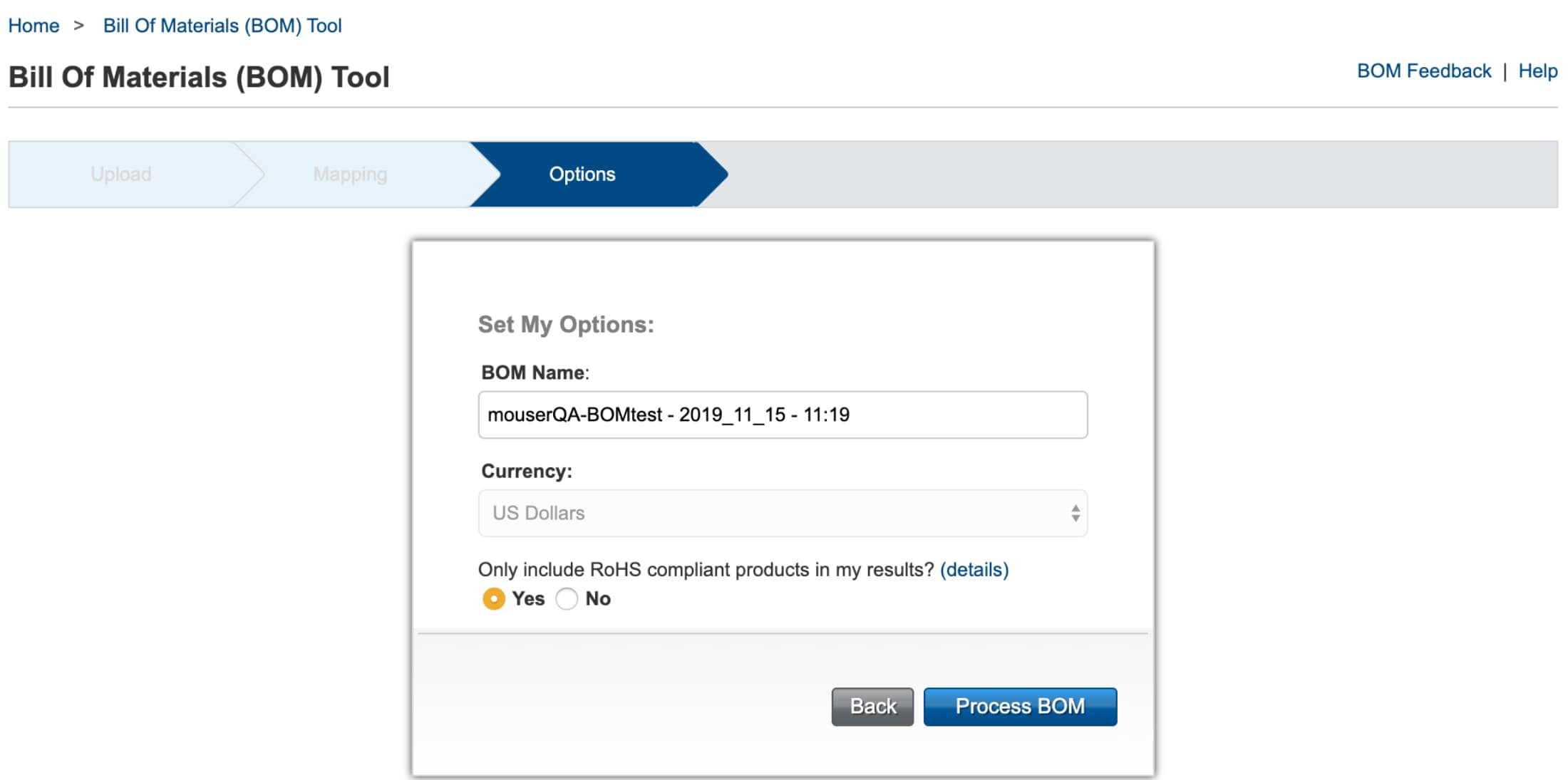 - Ja – Filtert BOM-Übereinstimmungen, um ausschließlich RoHs-konforme Produkte anzuzeigen.
